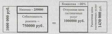 Для туроператора расчет по бартерной схеме бесспорно выгоден поскольку, во-первых, ставит его в более выгодное, чем других туроператоров положение в отношениях с поставщиком. Поставщик чувствует себя обязанным столь щедрому туроператору и, разумеется, идет на всякого рода уступки в отношениях с ним. Во-вторых, туроператор получает туристические услуги поставщика по минимальным ценам, а это главный шаг к росту прибыли туроператора. Природа сверхприбыли туроператора при проведении бартерных операций заключается в так называемой «двойной наценке» товаров и услуг, участвующих в бартерном обмене. Прежде всего, предоставляемые туроператором поставщику товары или услуги имеют заложенную в их отпускной цене долю прибыли туроператора. Кроме того, «вторая наценка» объясняется размерами повышенной комиссии со стороны хотельера (за крупный размер заказов его гостиничных услуг). Описанный пример, с финансированием туроператором ремонта отеля на 1 000 000 грн. можно изобразить так: