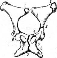 1 — крестцового бугра, 2 — маклака, 3 — тела подвздошной кости, 4 — впадинной ветви лонной кости, 5 — впадинной ветви седалищной кости, 6 — седалищного буг­ра, 7 — линии симфизарного перелома лонных и седалищных костей, 8 — через суставную впадину.