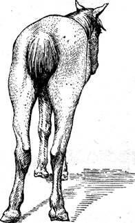 Для перелома внутреннего подвздошного бугра характерно отхождение отломка кости книзу; при разрыве крестцово-подвздошных связок возможны болезенное опухание и крепита­ция; хромота при движении шагом часто отсутствует, а во время быстрого аллюра конеч­ность выносится вперед неполно. В случае перелома тела под­вздошной кости появляется сильная хромота опирающейся конечности; наружный под­вздошный бугор опускается книзу (рис, 8, 9).
