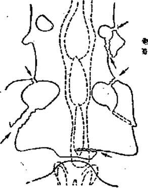 В. И. Подгорный предложил для точной диагностики перелома костей таза и крестца у крупного рогатого скота интраректальный и интравагиналъный методы рентгенографии с применением мягкой кассеты овальной формы (рис. 10) размером 13 X 24 см.