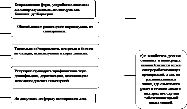 В угрожаемой зоне запрещают контакт и связи с неблагополучным пунктом; вакцинируют всех свиней; устанавливают дезбарьеры при входе и выходе из свинарников; строгий ветеринарно-санитарный контроль за заготовкой и вывозом свиней, сырья, фуража; ветеринарно-просветительная работа среди населения.