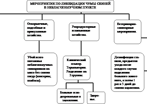 При подозрении на заболевание чумой больных животных изолируют, прекращают перегруппировки животных, неблагополучные станки дезинфицируют 2-3%-ым раствором едкого натра, вирконом С 1:350. Одновременно вводят жесткие ограничительные меры с целью недопущения распространения болезни. При установлении диагноза накладывают карантин и определяют границы угрожаемой зоны. Для ликвидации чумы свиней проводят комплекс ветеринарно-санитарных и организационных мероприятий, формирующих обстановку, исключающую возможность заражения свиней этой инфекцией. Мероприятия по ликвидации чумы свиней представлены в таблице.8