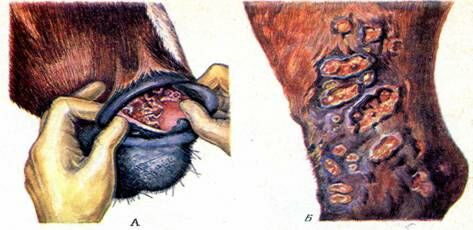 Острое течение сапа иногда сопровождается поражением кожи на внутренней поверхности бедер, в области препуция, мошонки, шеи. Процесс характеризуется воспалением подкожных лимфатических сосудов, образованием узелков и язв (рис. 4).