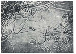 Б – мицелий и кпрптококки гриба в гное (Х 600).