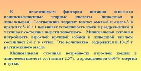 Для кошек незаменимой является арахидоновая кислота (другие животные могут синтезировать арахидоновую кислоту из линолевой). Арахидоновая кислота присутствует только в животных жирах и отсутствует в растительных продуктах. Линолевая кислота у собак и кошек может трансформироваться в линоленовую кислоту. Поэтому нет особых требований по нормированию линоленовой кислоты в рационах собак и кошек. Незаменимые жирные кислоты в рационе должны составлять 1% от сухого вещества корма или 2% от количества потребляемых калорий.