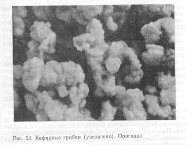 Кефир — кисломолочный продукт, для приготовления которого используют грибки, в состав которых входят мезо-фильные молочнокислые микроорганизмы и дрожжи. Такой симбиоз — результат длительного культивирования микроорганизмов в одной среде. Внешне кефирные грибки представляют собой светло-желтые белковые образования неправильной формы (рис. 53). Они могут быть сухими и влажными. В первом случае у них плотная консистенция, во втором — рыхлая. Сухие грибки неактивны. Поэтому перед применением их помещают на 12—24 ч в кипяченую и охлажденную до 30°С воду, а затем — в теплое пастеризованное молоко. За это время грибки набухают и после промывания могут быть использованы в качестве закваски для приготовления кефира.