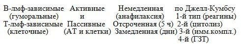 По скорости: Немедленные (анафилактические реакции), Отсроченная (через 5-6 ч: гемолитическая анемия, сывороточная болезнь), Замедленные (сутки: РТПХ, контактный дерматит, туберкулин).