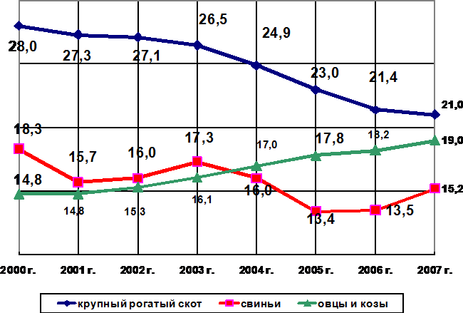 Проблемы экономических реформ в сельском хозяйстве привели к сокращению поголовья, ослаблению кормовой базы, снижению продуктивности скота. Численность крупного рогатого скота во всех категориях хозяйств в 1999 г снизилась на 2,5 %, овец и коз — на 6,4 %, или на 1,0 млн. голов (табл. 4).