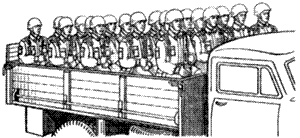 Например: «Отделение (взвод, рота), через правый, левый борта (задний борт) — К МАШИНАМ ». По этой команде личный состав быстро высаживается из машин и выстраивается около них (рис. 39) или действует по команде (приказу) своих командиров. При высадке из машин оружие берется как удобнее, а ротные пулеметы и другое тяжелое оружие передаются ранее высадившимся военнослужащим.