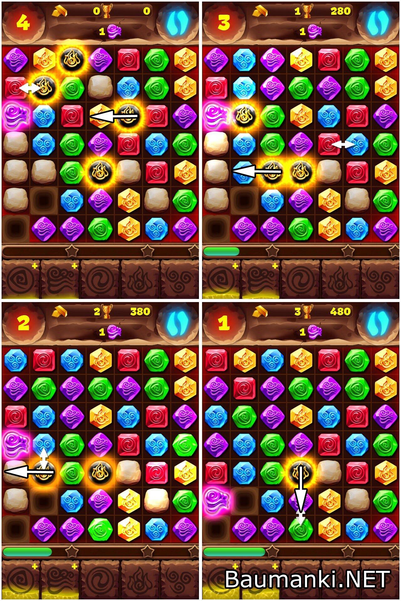 Начал играть в игрушку под названием "Планета самоцветов" на смартфоне... Игрушка интересная, но донат бесит (ну когда куча ограничений и "купи купи купи..."). Так вот: застрял не на долго на 80 уровне, который как оказалось в интернете мало кто может пройти. Решил выложить прохождение (смотри картинку). Алгоритм один и тот же, но что касается трёх звёзд, то как повезёт. Я раз 5 прошёл как на картинке, прежде чем получил максимальный результат. В общем спасибо за внимание - рассказывайте друзьям: