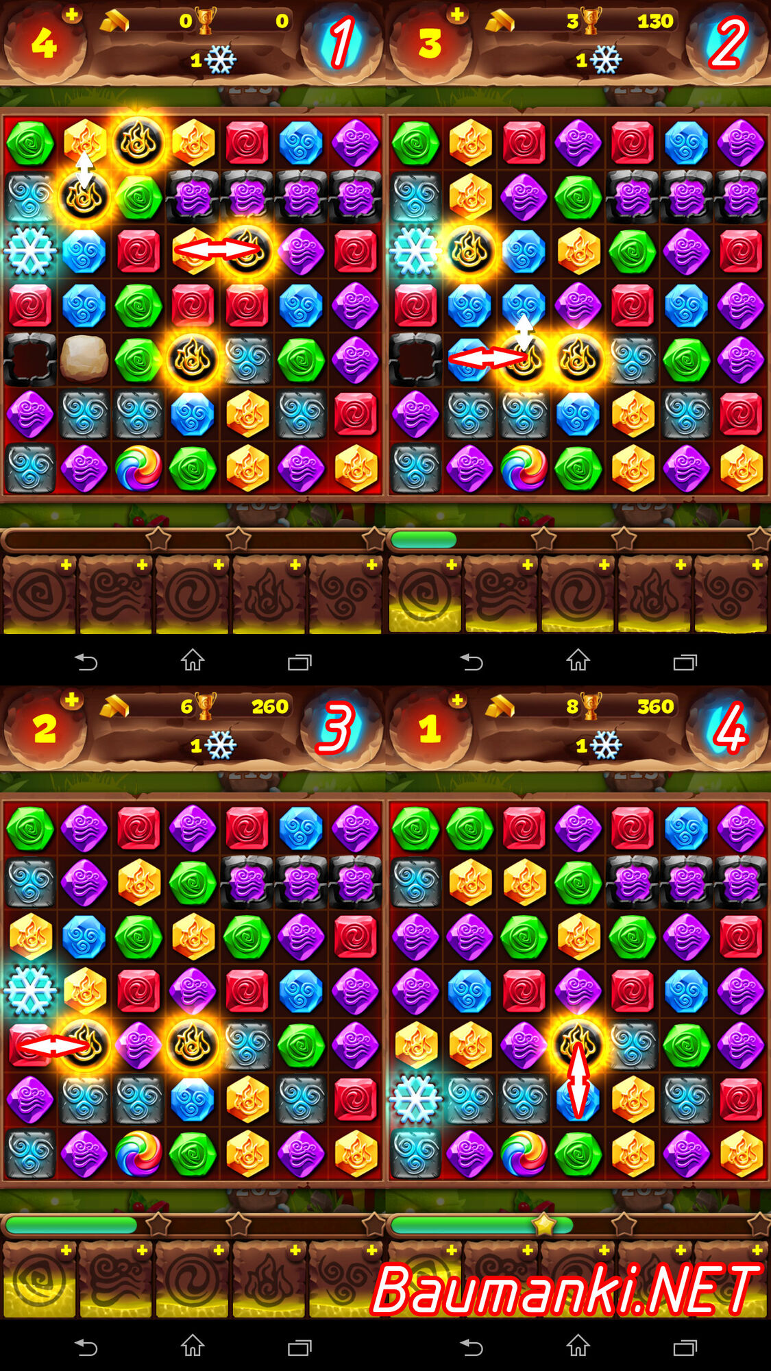 Смотрите на белые стрелочки обведённые КРАСНЫМ, так как сложно скриншот сделать, когда игра пытается подсказать куда ходить. Обратите внимание, что это прохождение на 3 звезды. Если сделать так раза три - получите 3 звезды 100%.