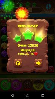 Теперь в общем-то концовочка, где нужно добить оставшиеся клетки, понаблюдать за взрывами оставшихся бонусов (если по ходу игры Вам удалось накопить хотя бы парочку), а затем заветные три звезды с данными о полученном золоте и +1 сердечко. Вот и всё, спасибо за внимание, заходите ещё и не забывайте делиться ссылкой на статью в социальных сетях, форумах и блогах! Заранее спасибо!!!