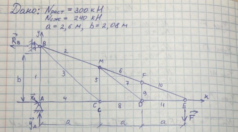 По заданным допускаемым усилиям на растяжение и сжатие найти предельную нагрузку на ферму консольного крана, изображенную на рисунке. Допускаемое усилие на растяжение Nраст=300кН Допускаемое усилие на сжатие Nсж=240кН а=2.6м, b=2.08 м