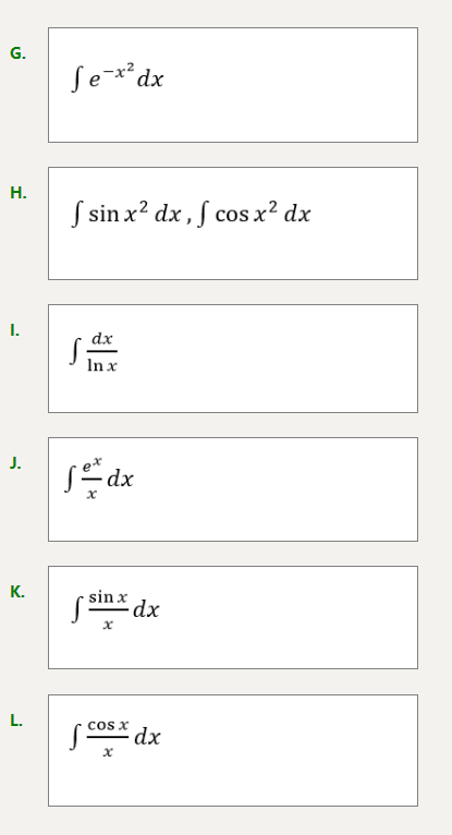 A. интеграл Пуассона B. интегралы Френеля C. интегральный логарифм D. интеграл, который приводится к интегральному логарифму E. интегральный синус F. интегральный косинус