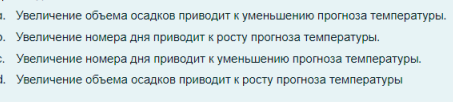 Ответ на вопрос №13589: Пусть температура в городе N-ске в марте описывается как T = 0.2*d - 0.05*r+3, где d - номер дня в месяце, r - объем осадков в день. Выберите ВСЕ верные утверждения: Пусть температура в городе N-ске в марте описывается как T = 0.2*d - - Ответ на вопрос №13589Пусть температура в городе N-ске в марте описывается как T = 0.2*d - - Ответ на вопрос №13589