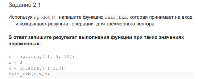 Ответ на вопрос №15040: Используя np.dot(), напишите функцию calc_kxb, которая принимает на вход и возвращает результат операции для трёхмерного вектора. В ответ запишите результат выполнения функции при таких значениях переменных: k = np.array([1, 5, 10]) b = 3 x = np.array([1,2,3]) calc_kxb(k,x,b) Используя np.dot(), напишите функцию calc_kxb, которая принимает на - Ответ на вопрос №15040Используя np.dot(), напишите функцию calc_kxb, которая принимает на - Ответ на вопрос №15040
