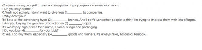 Ответ на вопрос по английскому языку №4662: Дополните следующий отрывок совещания подходящими словами из списка: I: Do you buy brands? R: Well, not actively. I don't want to give free (1). I: Why don't you? R: I hate all the advertising hype (2) I: Are you buying the genuine product or an (3) R: I won't pay high prices for a name, a famous logo and packaging. I: Do you buy (4). R: Yes, I do buy them, especially (5) to companies. brands. AndДополните следующий отрывок совещания подходящими - Ответ на вопрос по английскому языку №4662Дополните следующий отрывок совещания подходящими - Ответ на вопрос по английскому языку №4662