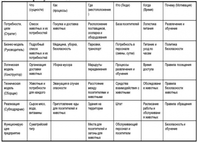 Ответ на вопрос №269896: Для описания зоопарка была использованамодель Захмана, приведенная на рисунке. Однако она неполная. Чем можно заполнить аспекты «как» (1) и «когда» (2) перспективы «функционирующее предприятие»? Количество посетителей (1) и Праздничные и выходные дни (2). Доставка посетителей в зоопарк (1) и Расписание работы транспорта (2). Кормежка и уход (1) и Расписание кормежки, уборки и обследованияДля описания зоопарка была использованамодель Захмана, приведенная - Ответ на вопрос №269896Для описания зоопарка была использованамодель Захмана, приведенная - Ответ на вопрос №269896