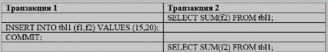 Представим, что в транзакции 2 выполняется SQL-оператор, использующий все значения поля f2. Затем в транзакции 1 выполняется вставка новой строки, приводящая к тому, что повторное выполнение SQL-оператора в транзакции 2 выдаст другой результат. Какая аномалия транзакции приведена в примере?