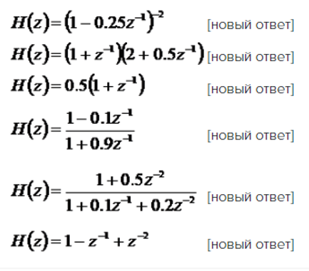Ответ на вопрос №34174: Даны передаточные функции фильтров, выберите только КИХ фильтрыДаны передаточные функции фильтров, выберите только КИХ фильтры - Ответ на вопрос №34174Даны передаточные функции фильтров, выберите только КИХ фильтры - Ответ на вопрос №34174