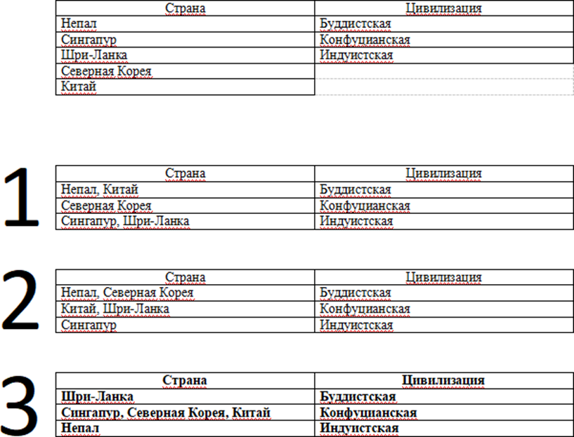 Вам предложили провести совместную исследовательскую деятельность с аспирантом N по теме «Восточные модели государственного управления». Одной из задач для Вас стало грамотное распределение стран по цивилизациям, к которым они относятся. У Вас на руках такие неотработанные данные:Составьте грамотную таблицу.
