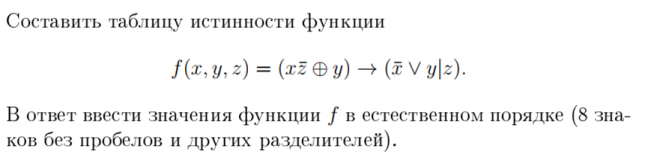Ответ на вопрос по дискретной математике №27451: Составить таблицу истинности функции f(x,y,z)=(xz0y)->(iVy|z). В ответ ввести значения функции f в естественном порядке (8 зна- ков без пробелов и других разделителей). Составить таблицу истинности функции - Ответ на вопрос по дискретной математике №27451Составить таблицу истинности функции - Ответ на вопрос по дискретной математике №27451
