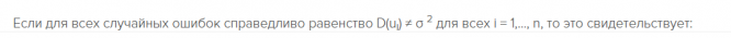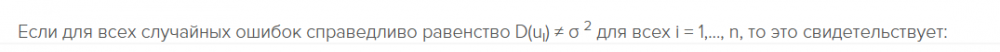 Если для всех случайных ошибок справедливо равенство D(ui) ≠ σ 2 для всех i = 1,…, n, то это свидетельствует: