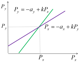 Общий рынок состоит из двух взаимозаменяемых товаров. Равновесие на каждом из рынков описано векторами цен Pxи Py.