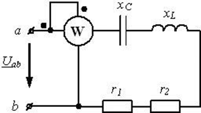 Определить показания ваттметра, если Uab = 10, r1 = 15, r2 = 5, xL = xc = 10.