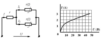 В электрической цепи 2 абсолютно одинаковых сопротивления подключены согласно схеме. Их ВАХ задана графиком. На вход цепи подано напряжение 20 В. Определите неизвестный ток I.