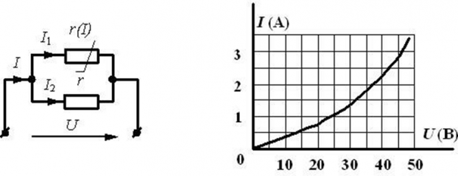 В электрической цепи 2 абсолютно одинаковых сопротивления подключены согласно схеме. Их ВАХ задана графиком. В цепи протекает ток 6 А. Определите входное напряжение.