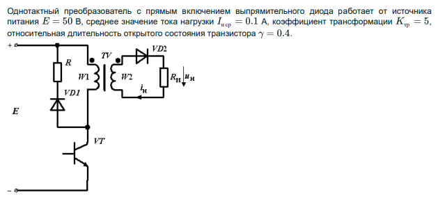 Ответ на вопрос по электронике №321720: Однотактный преобразователь с прямым включением выпрямительного диода работает от источника питания В, среднее значение тока нагрузки А, коэффициент трансформации , относительная длительность открытого состояния транзистора . Найдите величину сопротивления нагрузки. Ответ дайте в омах с точностью до целого значения. Однотактный преобразователь с прямым включением - Ответ на вопрос по электронике №321720Однотактный преобразователь с прямым включением - Ответ на вопрос по электронике №321720
