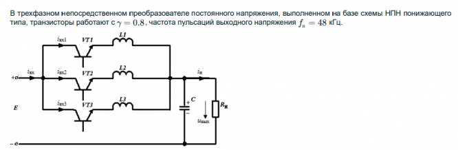 Ответ на вопрос по электронике №321723: В трехфазном непосредственном преобразователе постоянного напряжения, выполненном на базе схемы НПН понижающего типа, транзисторы работают с , частота пульсаций выходного напряжения кГц. Определите длительность открытого состояния транзисторов. Ответ дайте в мкс с точностью до целого значения. В трехфазном непосредственном преобразователе - Ответ на вопрос по электронике №321723В трехфазном непосредственном преобразователе - Ответ на вопрос по электронике №321723
