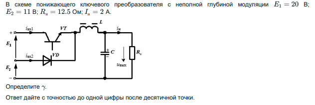 Ответ на вопрос по электронике №321730: В схеме понижающего ключевого преобразователя с неполной глубиной модуляции В; В; Ом; А. Определите . Ответ дайте с точностью до одной цифры после десятичной точки. В схеме понижающего ключевого преобразователя с - Ответ на вопрос по электронике №321730В схеме понижающего ключевого преобразователя с - Ответ на вопрос по электронике №321730