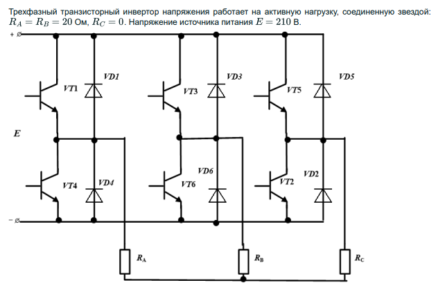 Ответ на вопрос по электронике №321732: Трехфазный транзисторный инвертор напряжения работает на активную нагрузку, соединенную звездой: Ом, . Напряжение источника питания В. Определите среднее значение потребляемого от источника тока, если ключи инвертора переключаются со 180-градусным алгоритмом управления. Ответ дайте в амперах с точностью до одной цифры после десятичной точки Трехфазный транзисторный инвертор напряжения работает - Ответ на вопрос по электронике №321732Трехфазный транзисторный инвертор напряжения работает - Ответ на вопрос по электронике №321732