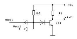Какой сигнал нужно подать на вход Uвх1 для получения логического нуля на выходе, если Uвх2='1'? Прямое падение напряжения на диодах считать равным 0.8 В, Uэб=0.8 В.