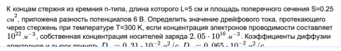 Ответ на вопрос по электронике №322204: К концам стержня из кремния n-типа, длина которого L=5 см и площадь поперечного сечения S=0.25 , приложена разность потенциалов 6 В. Определить значение дрейфового тока, протекающего через стержень при температуре T=300 K, если концентрация электронов проводимости составляет , собственная концентрация носителей заряда . Коэффициенты диффузии электронов и дырок принять К концам стержня из кремния n-типа, длина которого - Ответ на вопрос по электронике №322204К концам стержня из кремния n-типа, длина которого - Ответ на вопрос по электронике №322204