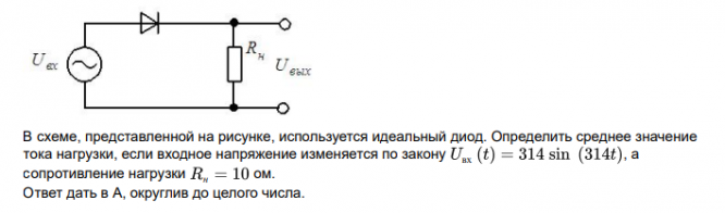 В схеме, представленной на рисунке, используется идеальный диод. Определить среднее значение тока нагрузки, если входное напряжение изменяется по закону , а сопротивление нагрузки ом. Ответ дать в А, округлив до целого числа