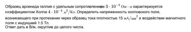 Ответ на вопрос по электронике №322209: Образец арсенида галлия с удельным сопротивлением характеризуется коэффициентом Холла . Определить напряженность холловского поля, возникающего при протекании через образец тока плотностью 15 и воздействии магнитного поля с индукцией 1.5 Тл. Ответ дать в B/м, округлив до целого числа Образец арсенида галлия с удельным сопротивлением - Ответ на вопрос по электронике №322209Образец арсенида галлия с удельным сопротивлением - Ответ на вопрос по электронике №322209
