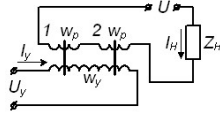 Определите коэффициент усиления по напряжению магнитного усилителя (см. рис.), если постоянное входное напряжение Uу=12 В, а на рабочую обмотку подается переменное напряжение U=240 В.