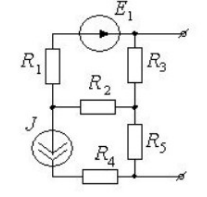 Дано: R1 = 1 Ом, R2 = 2 Ом, R3 = 6 Ом, R4 = 4 Ом, R5 = 5 Ом, E1= 40 В, J= 2 А. Определить сопротивление генератора, эквивалентного заданному активному двухполюснику.