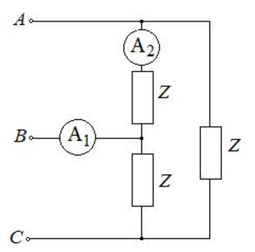 Амперметр А1 в симметричной трехфазной системе показывает 34,6 А. Определить показание А2.