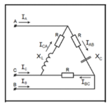 К трехфазному генератору, обмотки которого соединены по схеме "треугольник", подсоединен трехфазный приемник. Определить ІСА, если Ил = 380B, R=50 Ом, XL=Xc=100 Ом. Начальную фазу UAB принять равной 30.