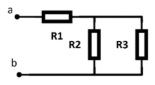 Чему равно Рэкв относительно зажимов а и b, если R1=3 Ом, R2=2 Ом, R3=2 Ом?