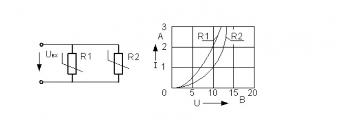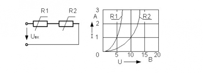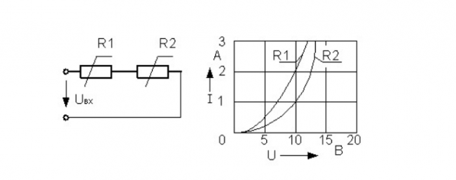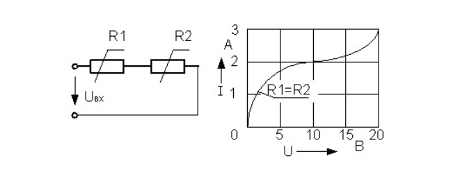 В электрической цепи 2 абсолютно одинаковых сопротивления подключены согласно схеме. Их ВАХ задана графиком. На вход подано напряжение 20 В. Определите ток через сопротивление R 1.