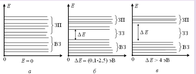 В кристалле (из-за взаимодействия атомов) каждый уровень изолированного атома расщепляется на множество близко расположенных подуровней, образующих энергетическую зону