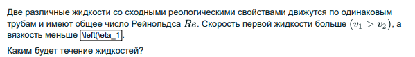 Две различные жидкости cо сходными реологическими свойствами движутся по одинаковым трубам и имеют общее число Рейнольдса . Скорость первой жидкости больше , а вязкость меньше Каким будет течение жидкостей?