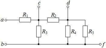 Определите эквивалентное сопротивление цепи между зажимами a и d, если R1=6 Ом, R2=5 Ом, R3=15 Ом, R4=30 Ом, R5=6 Ом.