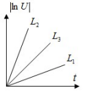 На рисунке показаны зависимости логарифма амплитуды напряжения на обкладках конденсатора от времени в трех колебательных контурах, обладающих одинаковым сопротивлением.
