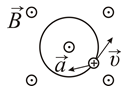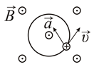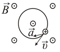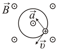 4.25. В постоянном однородном магнитном поле, созданном электромагнитом с дискообразными полюсами, на некотором расстоянии от оси полюсов закреплена положительно заряженная частица. Частица выстреливается так, что вектор ее скорости перпендикулярен силовым линиям магнитного поля и направлен по касательной к окружности, плоскость которой перпендикулярна вектору B, а центр лежит на оси полюсов. Скорость частицы такова, что она движется именно по этой окружности. В некоторый момент ток в обмотках электромагнита начинает увеличиваться. На каком рисунке приведено правильное сочетание направлений векторов скорости и ускорения частицы?